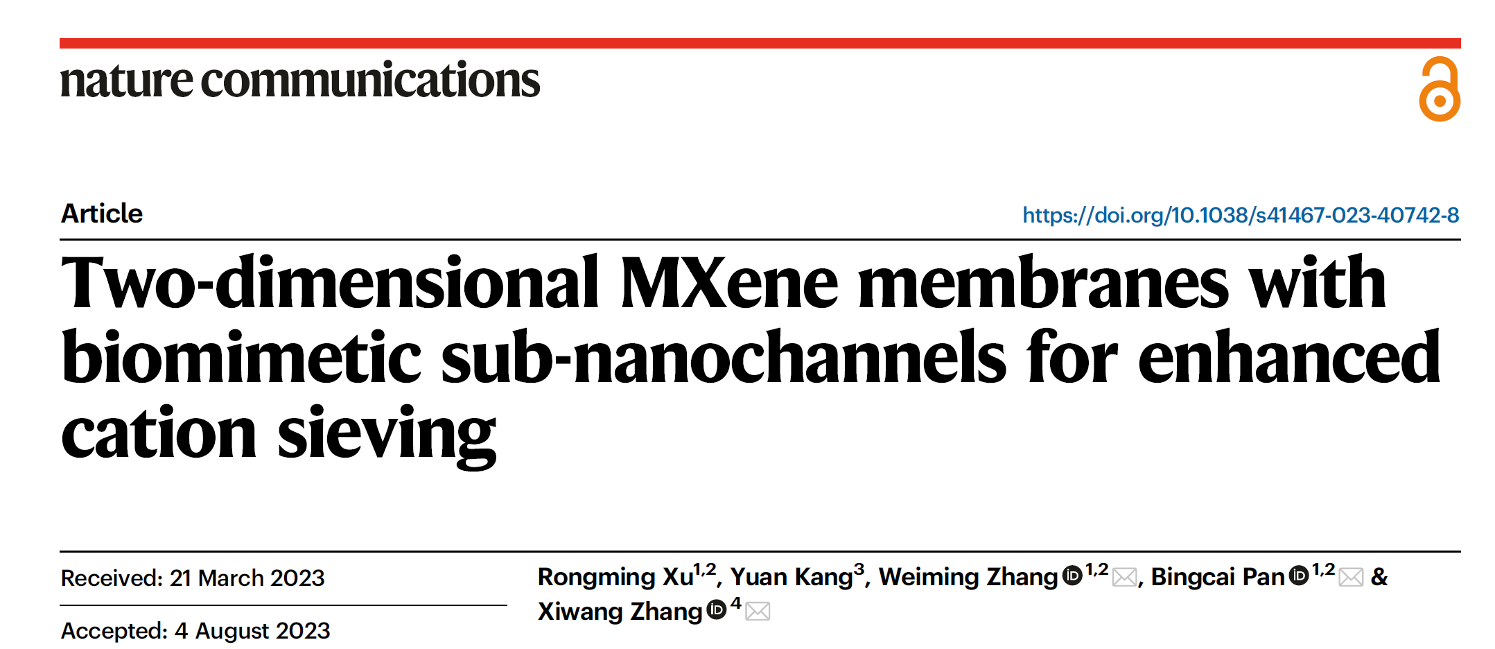 该研究以" Two-dimensional MXene membranes with biomimetic sub-nanochannels for enhanced cation sieving"为题,发表在知名学术期刊Nature Communications上(原文链接://www.nature.com/articles/s41467-023-40742-8)。张炜铭教授课题组2020级博士研究生许荣明为论文的第一作者,张炜铭教授、潘丙才教授和昆士兰大学张西旺教授为通讯作者,莫纳什大学博士后康源为共同作者。该项目得到了国家重点研发计划(2021YFA1201700)和国家自然科学基金(U22A20403)的资助。