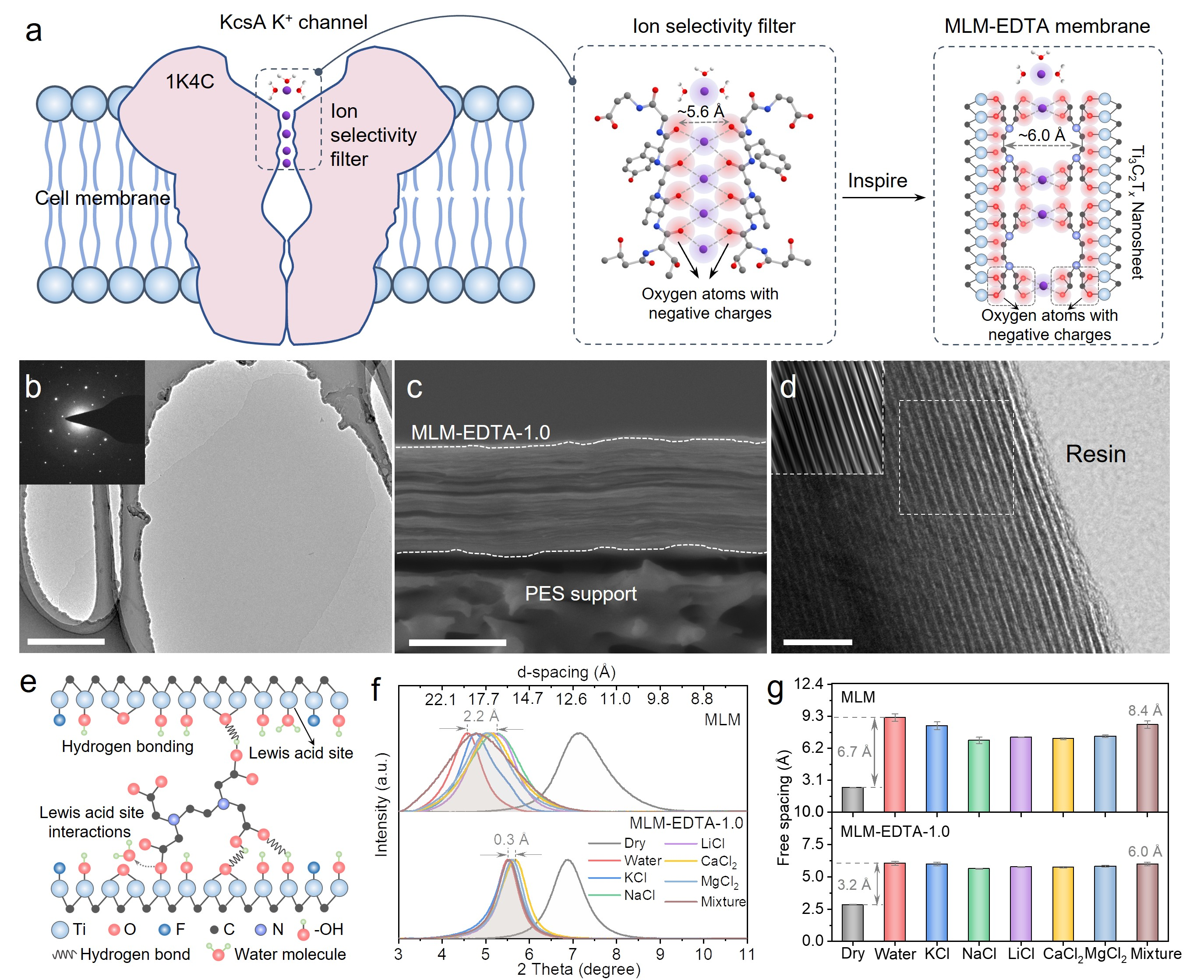 为此,南京大学张炜铭教授、潘丙才教授联合昆士兰大学张西旺教授提出以二维MXene层状膜为基础,EDTA分子为离子识别特异性位点,构造出了具有类似钾离子通道(KcsA K+)尺寸和特异性亲和位点的二维亚纳米通道膜(MLM-EDTA)。KcsA K+生物离子通道具有约5.6埃的过滤器尺寸以及8个带负电荷的氧原子,该构造能够快速高选择性地运输特定离子以维持生命的正常活动。为了模仿这种结构,他们提出了二维MXene膜结合EDTA分子的构造思路(图1a)。EDTA分子和MXene纳米片之间的桥连机制主要是通过大量的氢键作用以及Ti-OOC键的作用(图1e),在这种作用下,EDTA分子就像"胶水"一样把相邻纳米片连接在一起,使得MXene膜变得更加致密有序,而且具有优异的抗溶胀性能,使得MLM-EDTA在盐溶液中保持6埃左右的层间距(图1f, g)。
