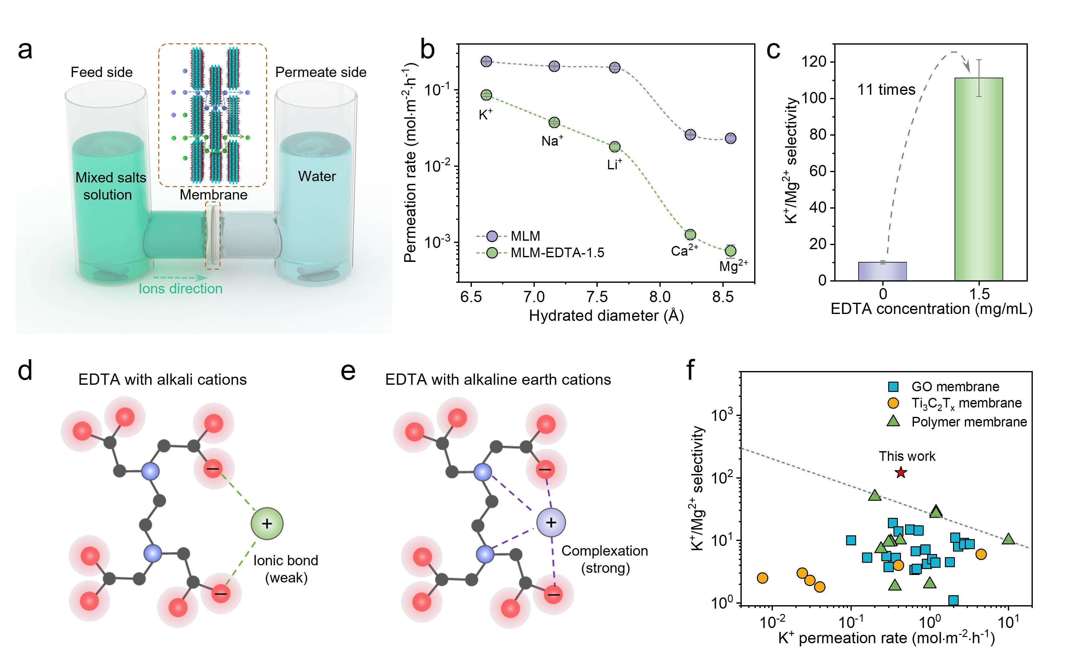 图2:MLM-EDTA优异的离子分离性能以及EDTA分子的离子识别功能。
