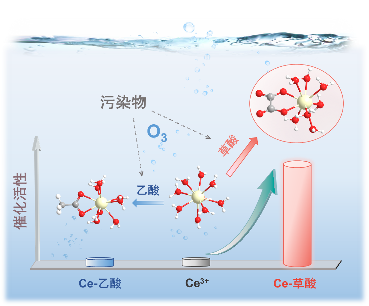 臭氧氧化是规模化水处理中广泛应用的高级氧化工艺。皇冠体育投注-皇冠体育盘口 单超副教授、潘丙才教授课题组选取了臭氧氧化中本身催化惰性但蕴藏催化活性潜力的Ce(III/IV)为目标调控对象,基于有机物在臭氧氧化过程中普遍产生小分子羧酸为主要终端产物的认知,设想部分种类的小分子羧酸有望作为原位内生配体通过配位调控将Ce(III/IV)持续活化为臭氧氧化的催化剂。研究发现,有机物臭氧氧化降解生成的不同种类小分子羧酸配体对Ce(III/IV)的活化效应具有明显差异,其中草酸可作为强效配体显著活化Ce(III/IV),将臭氧分解速率常数和阿特拉津降解速率常数分别提高11.5倍和5.8倍;同等条件下乙酸并未对Ce(III/IV)表现出明显的活化效应。进一步研究发现,Ce(III)-草酸络合物是强化污染物降解的催化活性物种,草酸配体显著的供电子效应是活化Ce(III/IV)的关键;仅依靠原位持续生成的草酸(无需外源添加),微量Ce(III/IV)即可实现臭氧氧化的自催化矿化和污染物共降解。这一工作突破了外源添加有机配体这一传统调控策略在高级氧化体系中配体易降解失效、有机负荷明显增加的挑战,为探索面向真实应用场景的水处理催化活性调控提供了范例。