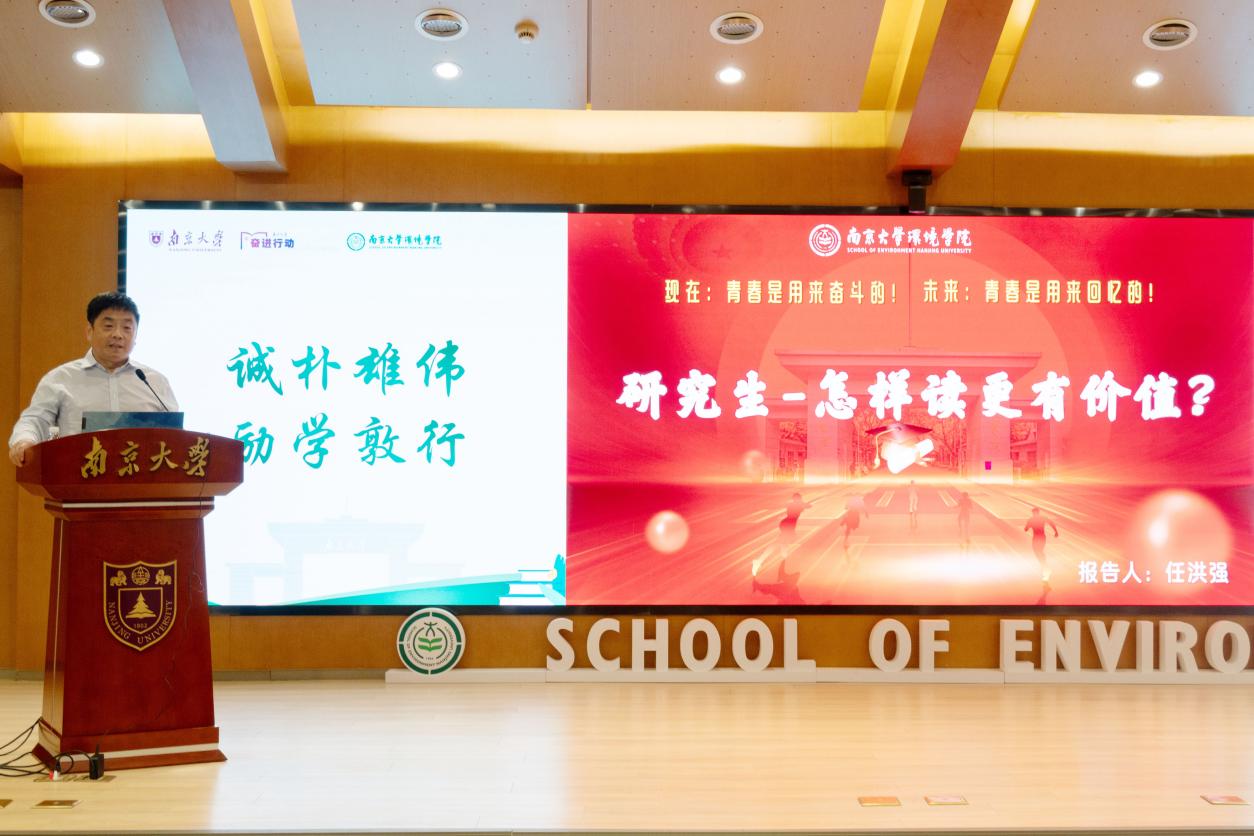 任洪强院士以"研究生——怎样读更有价值"为题,为新生讲授"灯塔引航"院长第一课。他谈到读研是个人成长的新起点,并与同学们交流了应当在哪些方面提升自身能力素质;强调在科研中要坚守学术诚信,遵守实验室安全规定和操作要求,建立和谐融洽师生关系,提升团队协作能力。他希望同学们牢记习近平总书记给南京大学留学归国青年学者的重要回信精神,弘扬科学家精神,传承报国理想,以生态环境科技创新助力美丽中国建设。最后,任洪强寄语学院2024级新生让兴趣成为引擎、让努力成为习惯、让钻研成为爱好、让坚持成为品质,在人生马拉松竞赛中跑出巅峰!