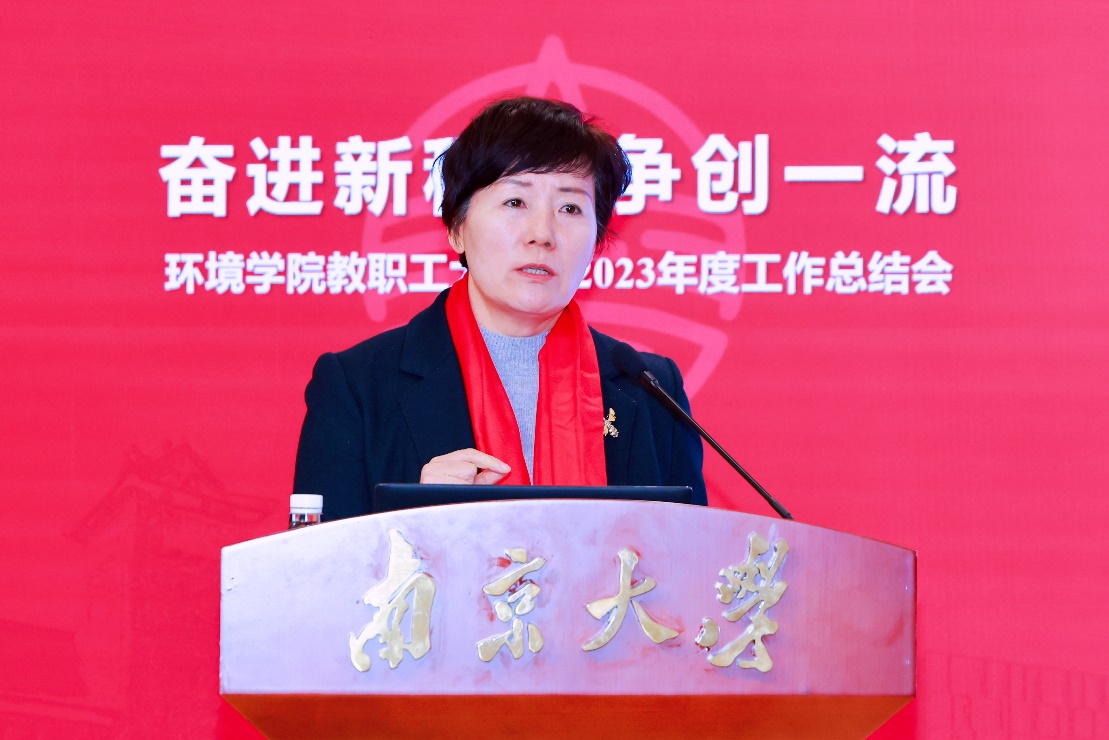 刘建萍书记围绕党建引领促发展、砥砺奋进谱新篇作党委年度工作报告。刘书记从强化理论武装、凝聚育人合力、围绕中心工作等方面展开,介绍了学院党委提升党建工作质量、夯实立德树人成效、全面推进"奋进行动"的具体举措和取得的成效。刘建萍书记表示,过去的2023年全体教职工团结奋进、辛勤耕耘,取得了喜人的成绩:任洪强院士牵头申报的"水质风险控制工程学"国家基础科学中心项目成功获批,任洪强院士领衔的"工业废水治理技术与装备团队" 荣获首批"国家卓越工程师团队",环境类"顶天立地"型人才培养探索与实践获国家教学成果二等奖,学科新增国家级领军人才2人、国家级青年人才4人等。刘书记代表学院党委对环境行业校友会、优秀教师支部书记、教育教学教改先进、科学研究优异、综合事务及实验室安全实表现突出、年度优秀教职工等集体和个人进行了表彰。